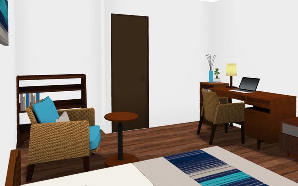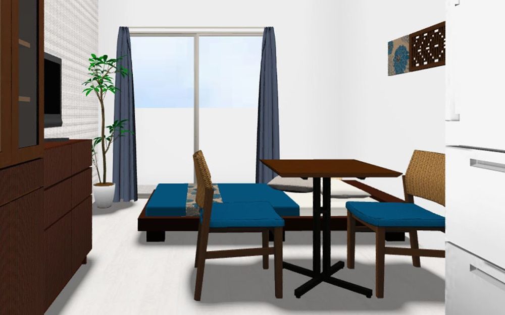 3Dシミュレーションでは、家具の雰囲気だけではなく、お好みのカラーコーディネートがどのような雰囲気なのかもご覧いただけます。簡単にファブリックや装飾などの色を変える事ができるため、8畳1Kやワンルームのインテリアを検討の際は、試してみましょう。