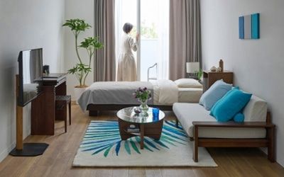 色鮮やかなブルーをソファのカバーやベッド周りに使うことで、爽やかな雰囲気のインテリアを演出。