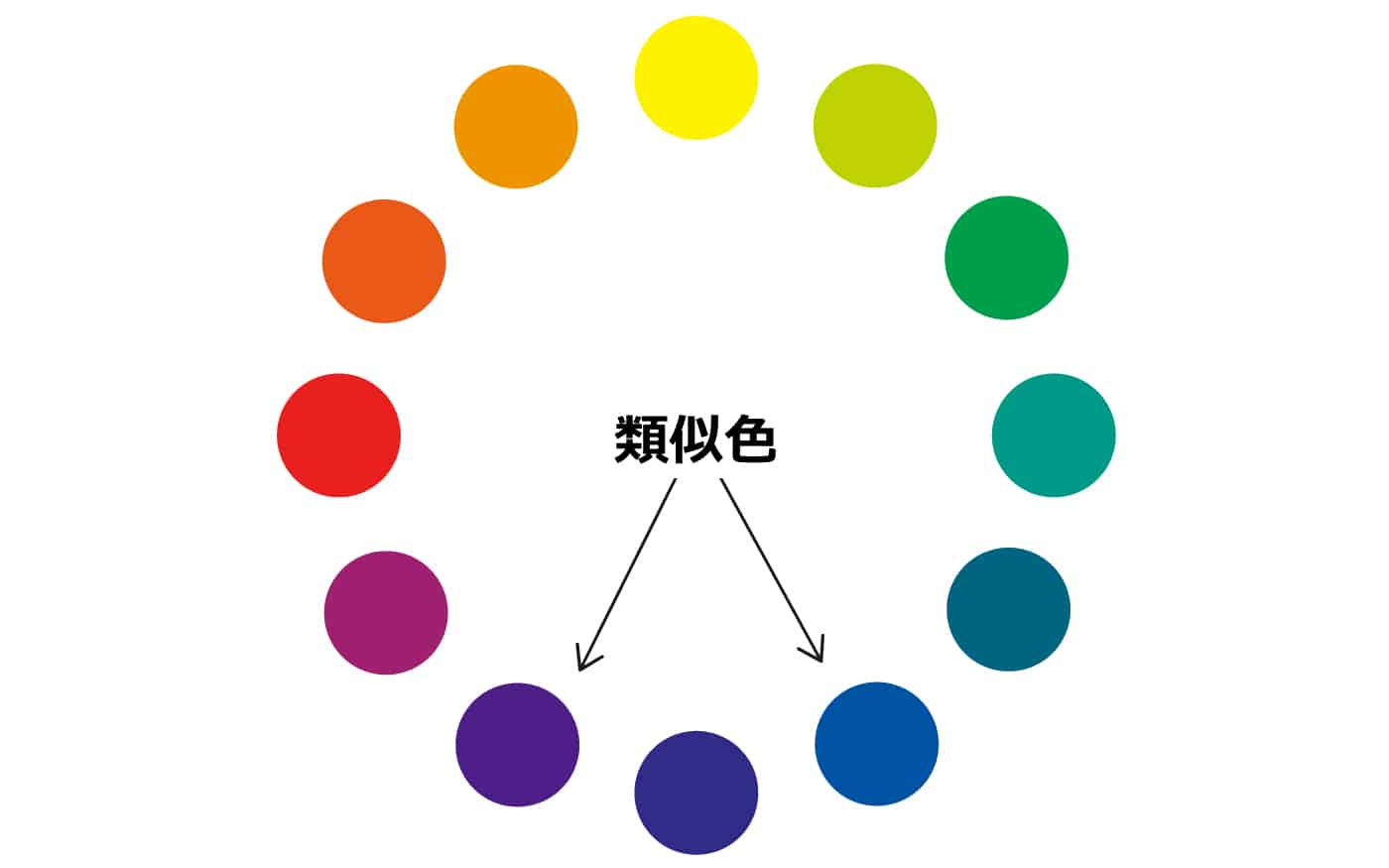 色相が隣り合っている色を類似色と言い、その組み合わせを「隣接色相配色」と呼びます。隣接色相配色は色相環で近い位置にある色同士を組みわせるため、まとまり感のある取り入れやすい配色と言えるでしょう。以下例の以外にも赤と橙、緑と青など使いやすい配色が多く見受けられます。
