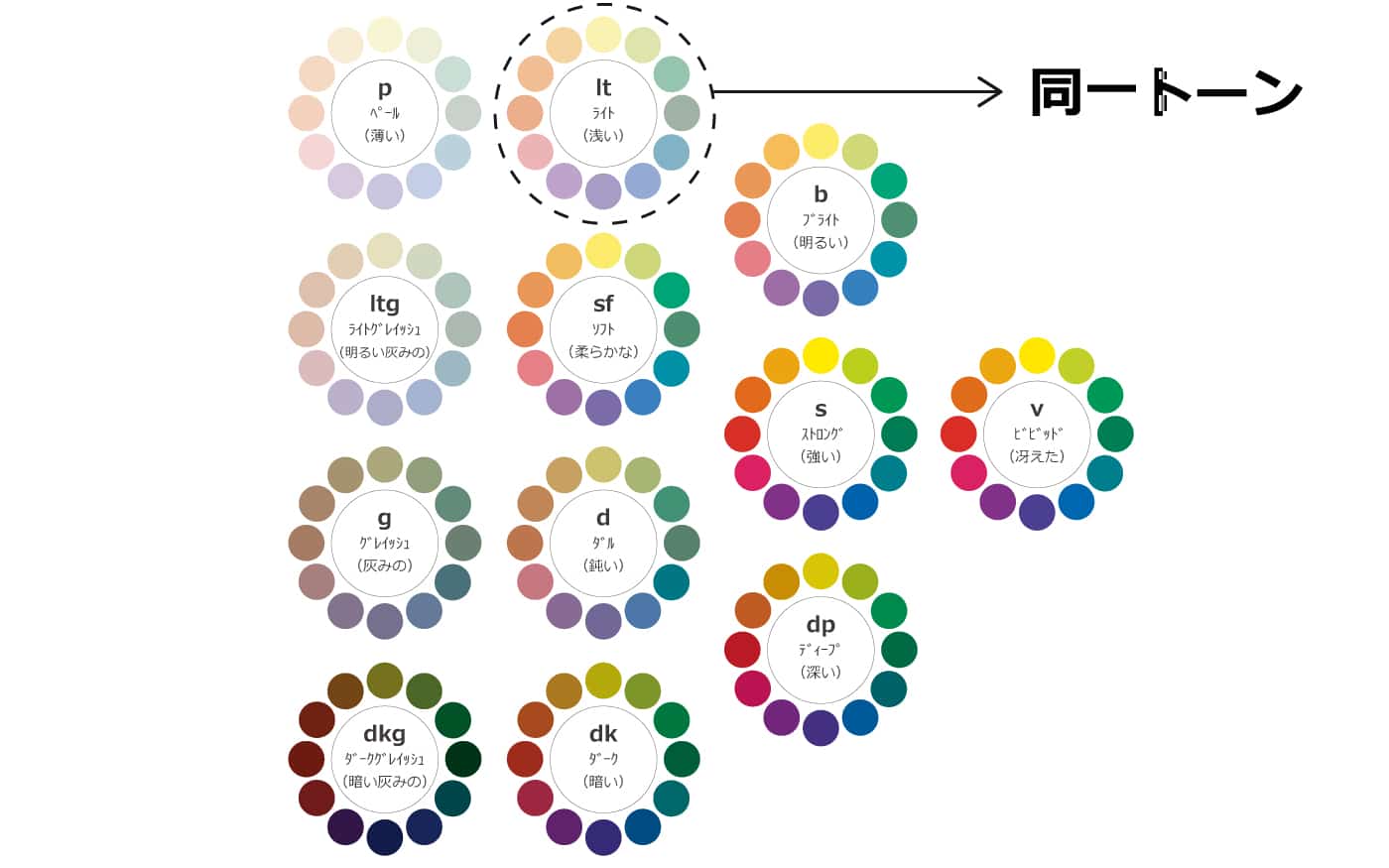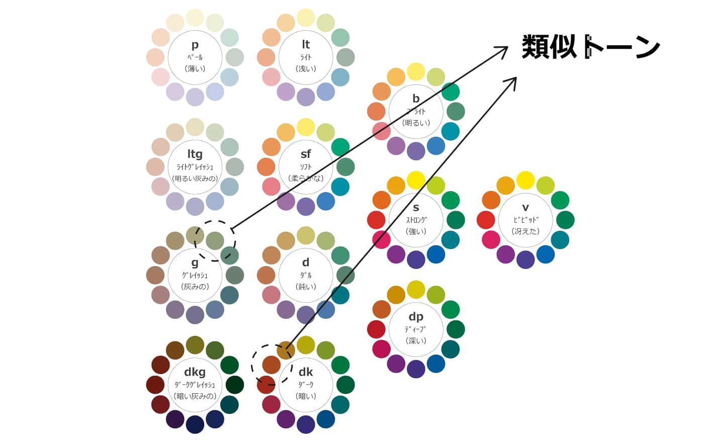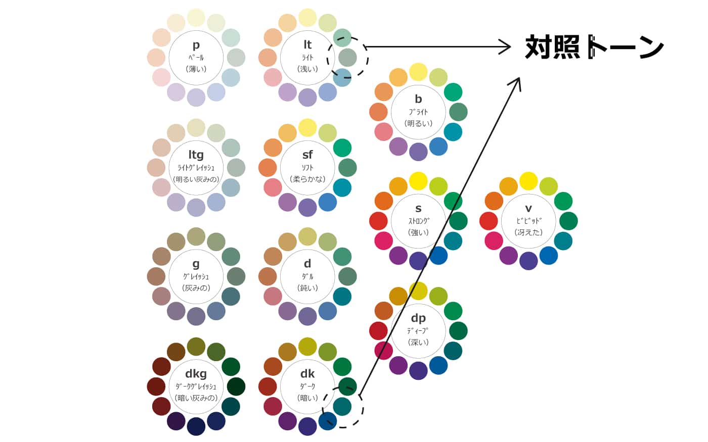 原色の明度・彩度を変えることで主に12のトーンとして色調が変わる点を覚えておきましょう。