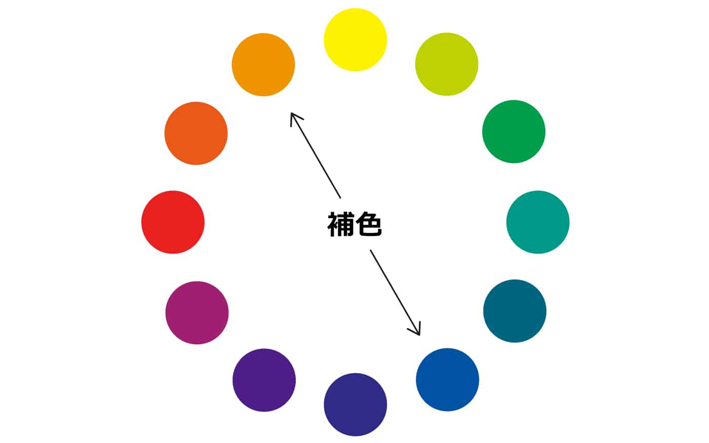 色相環上で離れた位置にある色同士の組み合わせを「対照色相配色」と呼びます。 色の持つイメージが異なる配色になるため、 暖色⇔寒色、中性色同士などコントラストが強く、視覚的な引き立て効果に期待できるでしょう。色相が遠い組み合わせになるため、トーンを揃えることでまとまり感が出るでしょう。