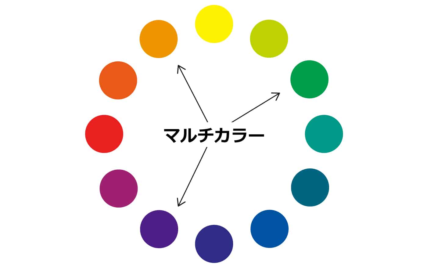 3色以上でつくる配色全般を「マルチカラー配色」と呼びます。2色使いは「ツートーンカラー」と呼ばれ、色が増えていくと4色配色(テトラード)、5色配色(ペンタード)、6色配色(ヘキサード)と呼ばれます。色が増えるほど複雑でセンスが問われるため、多くても3-4色に抑えるのが無難です。