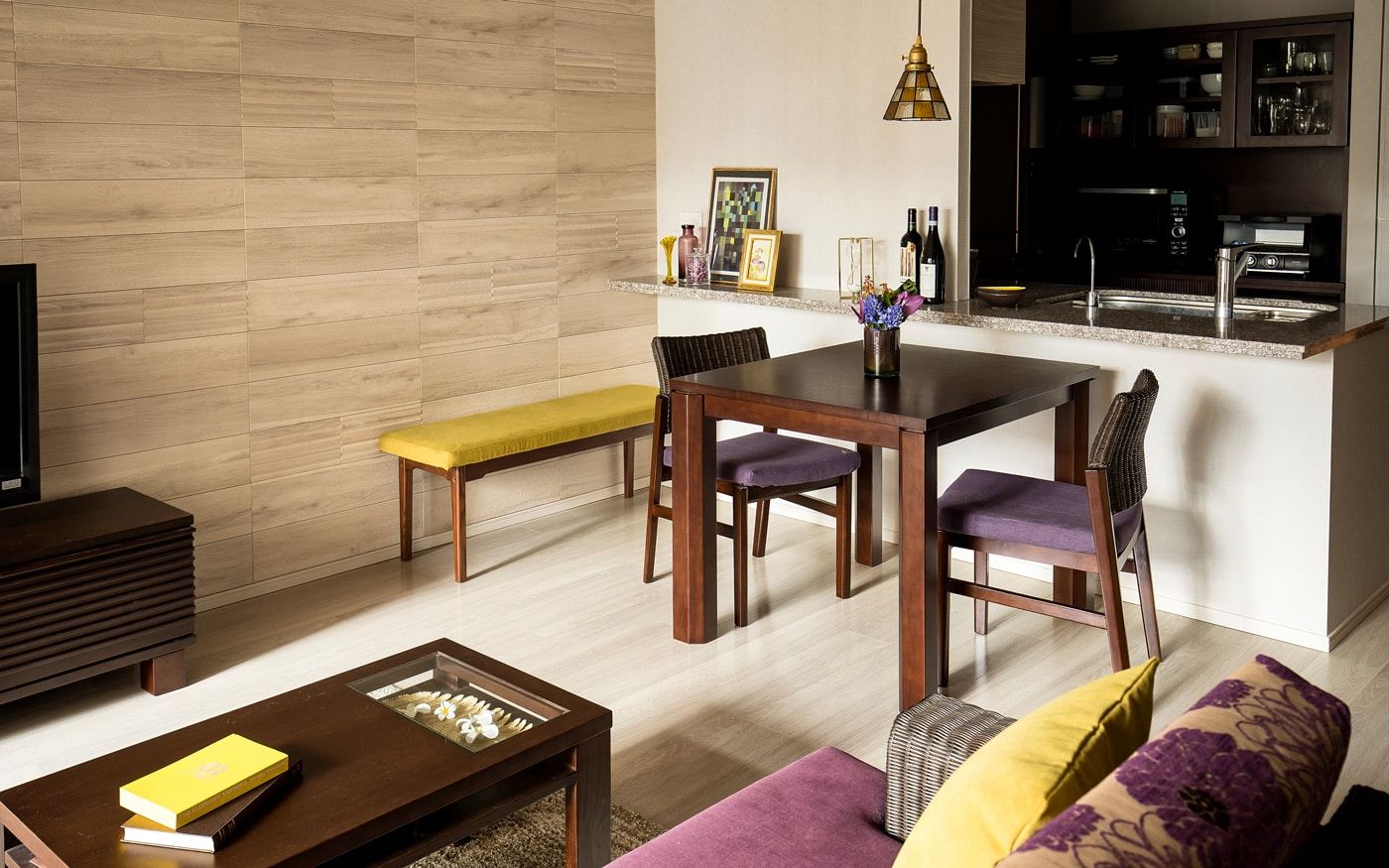 無彩色をベースに華やかなパープルで彩るダイニング・インテリア実例