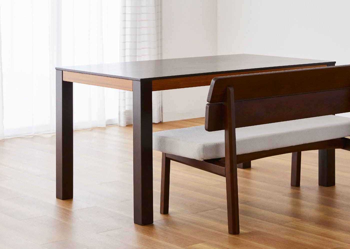 ウッド・ダイニングベンチの塗装色は二種類ご用意しています。ダークブラウン色の濃いカラーは高級感や上品な部屋作り、木の温もり感も欲しいという方に人気の色合いです。グレインブラウン色は木の温もりや風合いを楽しめる無垢材家具にマッチします。無垢ならではの存在感や癒しの空間、曲線の家具デザインなどと相性が良い塗装色です。