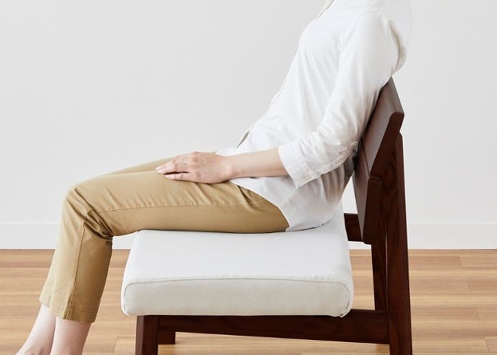 二枚の無垢板の角度を変えることによって、ゆるやかに「く」の字を描いた背もたれに身体がフィットし、背骨が自然なS字曲線を描くことで、正しい座り姿勢を保ちます。