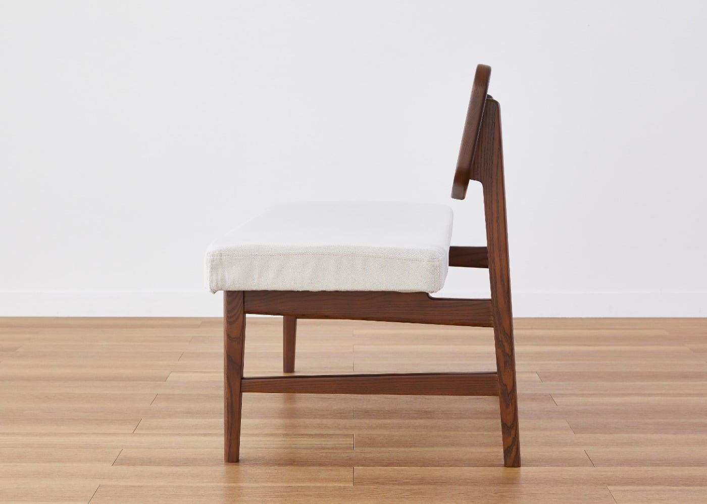 「ウッド・ダイニングベンチv02・背付」を真横からみると、二枚の無垢材が背中にフィットする角度になっています。