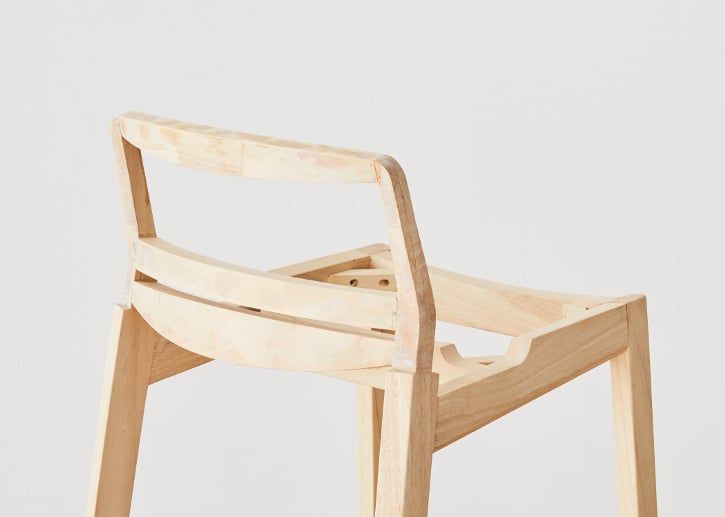ハブ・カウンターチェアの商品開発プロセスにおいて、最重要だったのは背もたれのデザインと椅子の耐久性でした。薄厚で曲線を描く背もたれと印象的な背の傾斜造りには、背もたれの内部構造に耐久性を持たせる必要がありました。また、後側から見たハブ・カウンターチェアは、背面下部の緩やかな円弧曲線に目が引かれます。このデザインを擬似的に造りあげるために後脚木部に編み込まれる、ラタンやヒヤシンスの素材厚み分を削り「段差」部分を設けています。椅子の耐久性にも直結する部分の構造なので、慎重に構造の微調整と耐久性の確保を同時に進めるような開発プロセスでした。