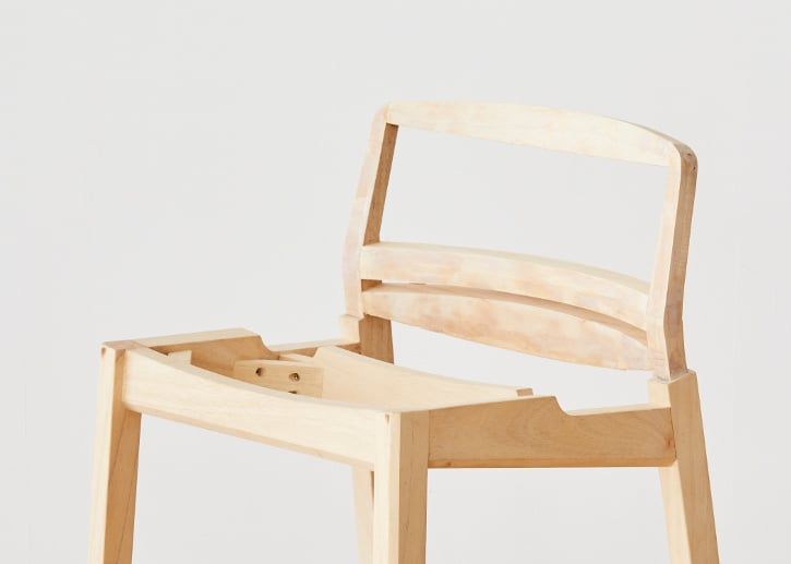 ハブ・カウンターチェアの特徴は背もたれのデザインですので、如何にして原案のデザインを擬似的に造りあげるかが課題でした。カウンターチェアの高さから考えれば、背もたれの耐久性は背高の低い他の椅子よりも、安全上高く設定する必要がありました。その為には、まず内部構造を強固にするべく曲線をつけた無垢材でフレーム組みをし、フレームの曲線との繋がりが出るように後脚に天然素材の厚み分の段差をつけました。この段差をつける際の注意点はフレームの曲線と同じ曲線的な形状にすることでした。