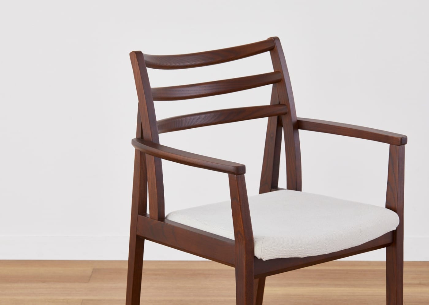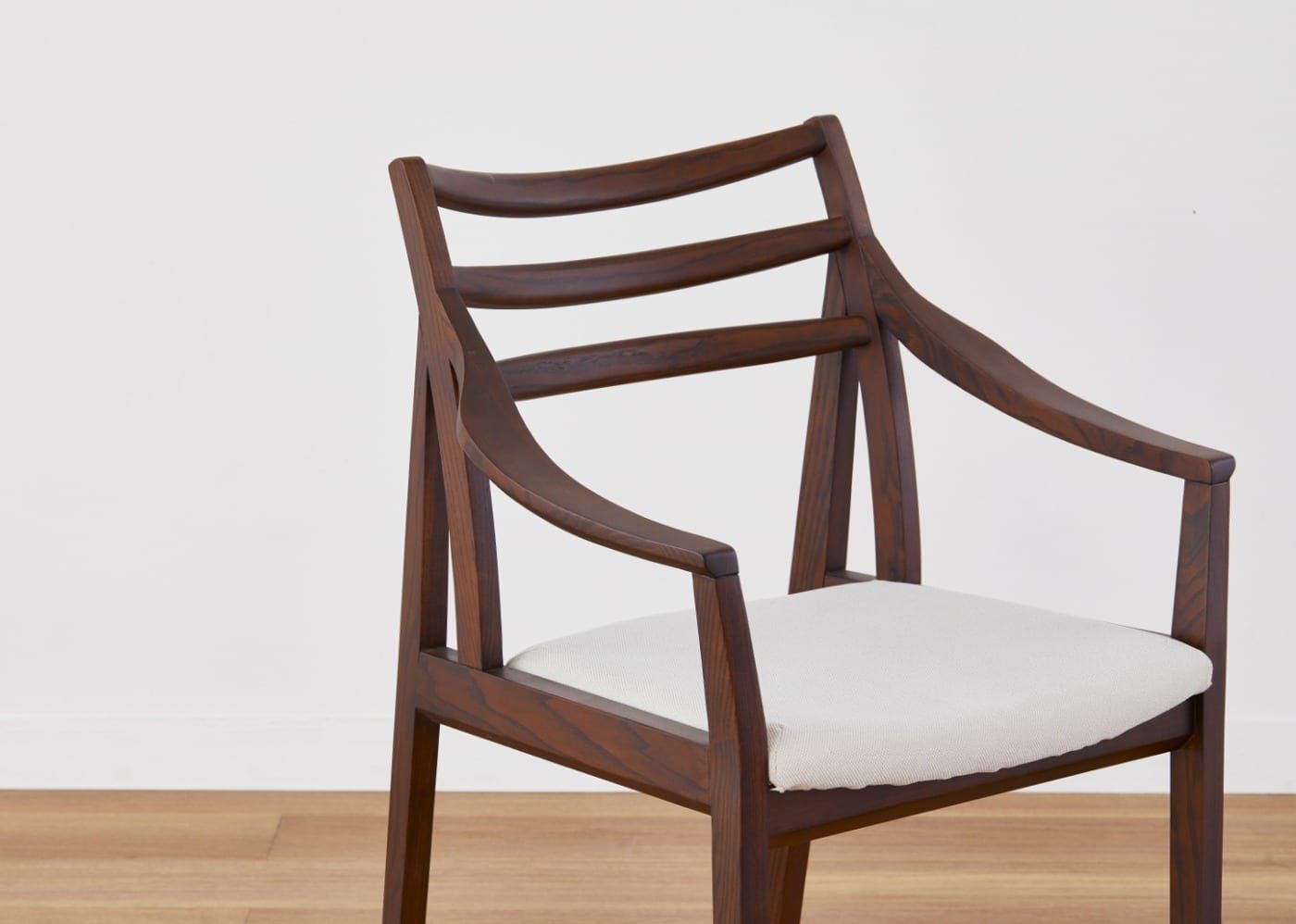 セイル・ダイニングチェアシリーズは座り心地にも拘りがあります。強度十分なトラス構造、計5回もの試作を繰り返して設定した背もたれの角度と三本の笠木・背貫の間隔調整により、背あたりのフィット感が格段に良くなりました。ダイニングアームチェアのゆったり感のあるアーム形状も含めて背柱・後脚・座枠が一体となり、座りごこちの良さを形成しています。