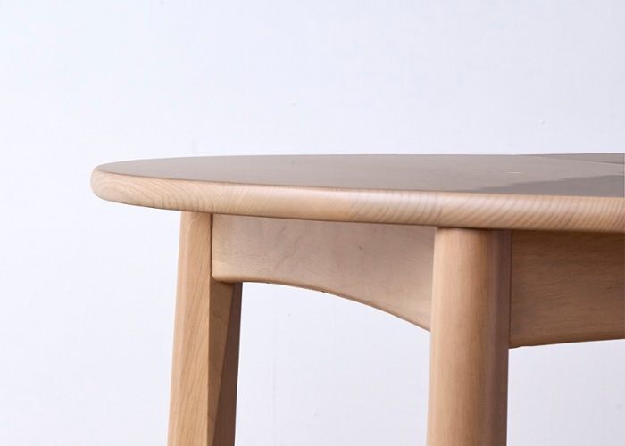 エン・伸長式ダイニングテーブルのデザインでは、天板の木口を丸みのあるかまぼこ型に仕上げ、触れたときの感触を柔らかくしています。脚の外面にも丸みを施しながらも内側に立体感を持たせており、全体的に優しい印象を与えるデザインです。これにより、どんなインテリアにも自然に溶け込み、家族や友人との集いの場を心地よく演出します。