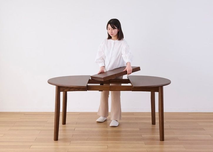 エン・伸長式ダイニングテーブルの最大のメリットは、伸長する際に使用する中天板を折り畳み式か一枚式から選べる点です。これにより、お客様はライフスタイルやデザインの好みに応じて、最適な選択が可能になります。スペースを有効に活用しつつ、インテリアに調和するデザインを楽しむことができるため、多様なニーズに応えることができます。