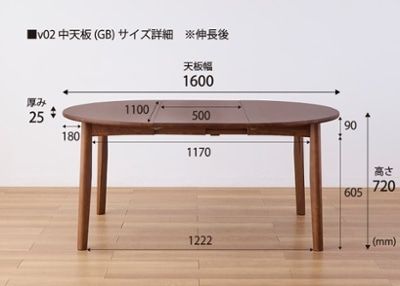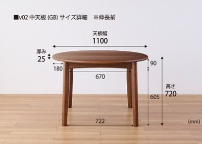 v02タイプの特徴は、そのシンプルさです。一枚板で構成されているため、テーブルを簡単に伸長でき、手間がかかりません。中央に継ぎ目がないため、木目が途切れることなく美しく繋がり、自然な風合いを楽しめます。このデザインは、見た目の美しさと機能性を兼ね備えており、ダイニングスペースに洗練された印象を与えます。