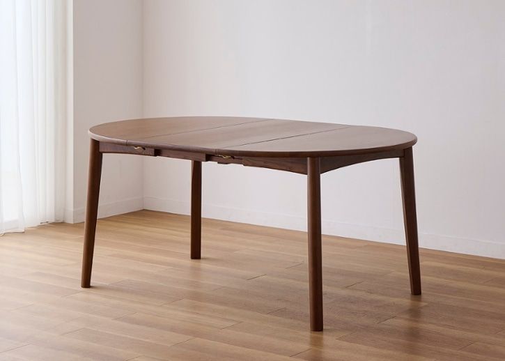 天板に無垢材を使用した伸長式のダイニングテーブルは、高級感と自然な美しさが魅力です。無垢材は耐久性が高く、使うほどに味わいが増しますが、その分重量が重く、移動や配置換えが少し大変になることがあります。それでも、円形から楕円形に伸長する機能性と、無垢材の温かみが、食卓に特別な雰囲気をもたらします。