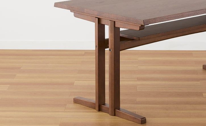 T字脚のローダイニングテーブルにすることで、チェアよりも重さのある背付ベンチを動かさなくても立ち回りしやすくなります。