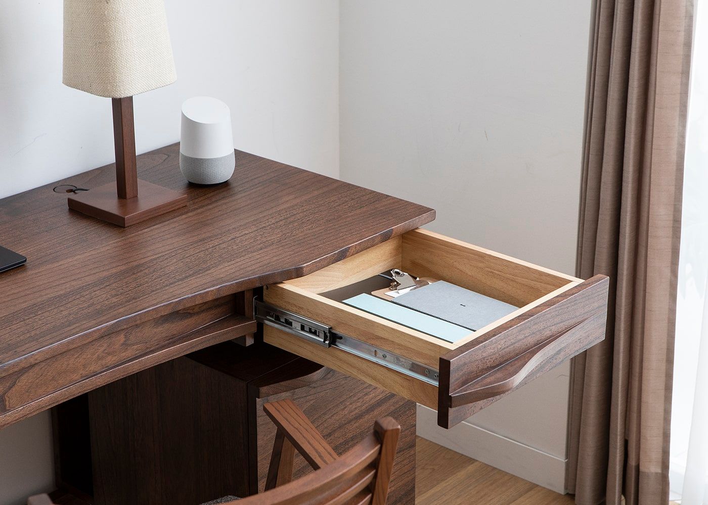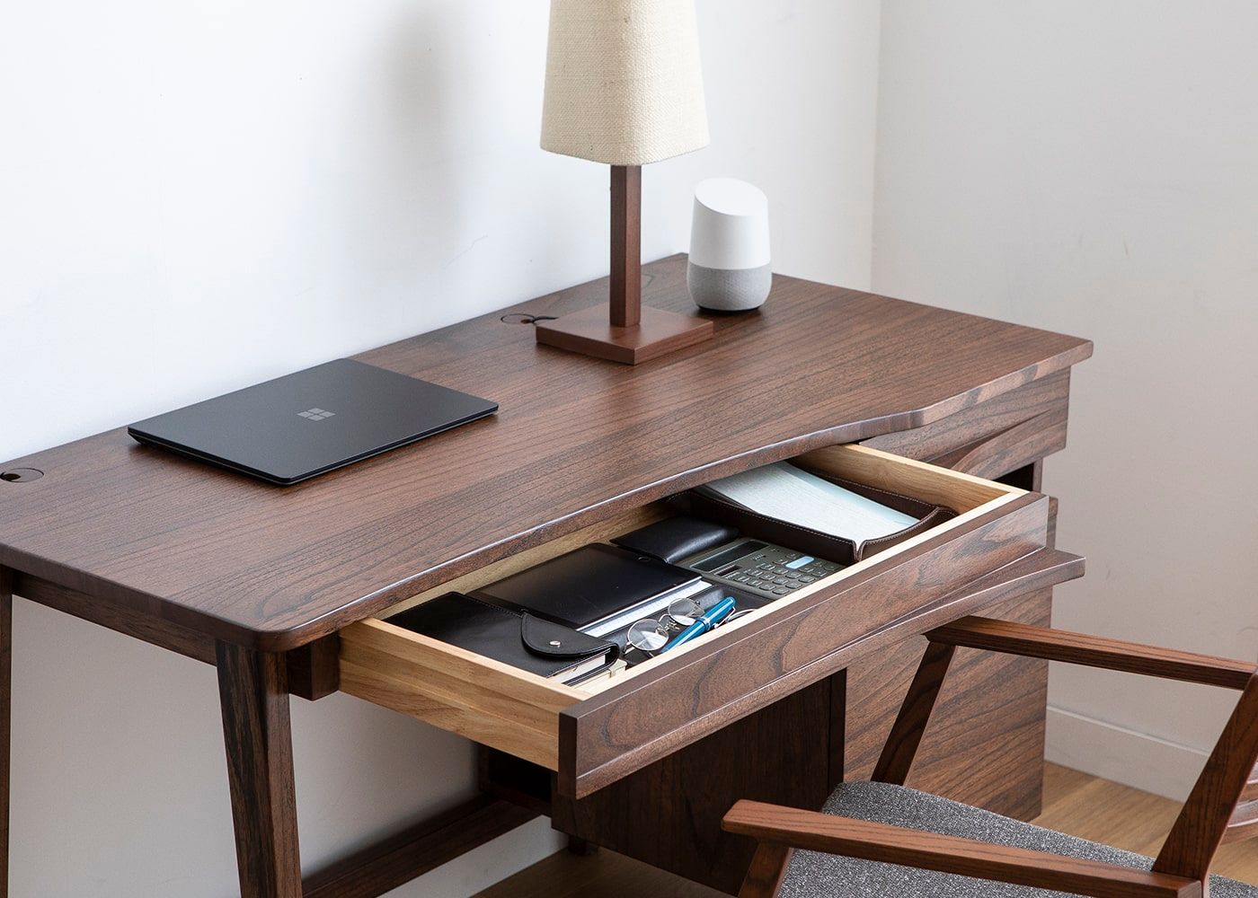 在宅がメインの方におすすめの高機能ワークデスク。幅1200mm×奥行580mmのゆったりとした天板は仕事がしやすい環境を生み、仕事部屋での作業が捗ります。また無垢材のため、時を重ねるごとに表情が変化して味わい深くなっていき、永く愛着を持って使用できる魅力も。