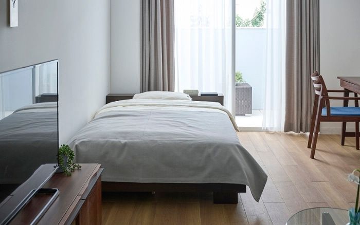 ホテルライクなインテリアでは、ベッド周辺の印象が重要。そのため1LDKでは寝室をメインにレイアウトを考えるのがおすすめです。ホテルらしくサイドテーブルを置いたり、寝室にテレビを設置するのもよいでしょう。