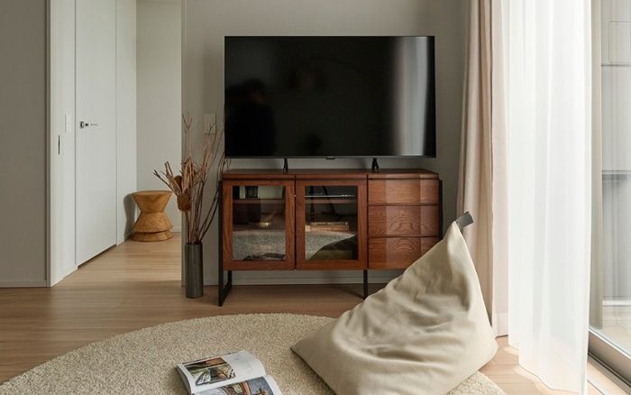 隠す収納を家具を選ぶ際は、デザイン性の高いおしゃれなものを選ぶのがおすすめ。高級感を漂わせ、ホテルのような雰囲気を演出してくれるはずです。また、テレビボード・キャビネット・食器棚など、収納家具といっても様々な種類がありますが、できる限り同じデザイン・色で統一すると、さらに洗練されたコーディネートに仕上がります。