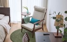 一人暮らしなら大きなソファは置かず、1人掛けのラウンジチェアですっきりまとめるのもおすすめ。ホテルの客室のような雰囲気を演出できます。