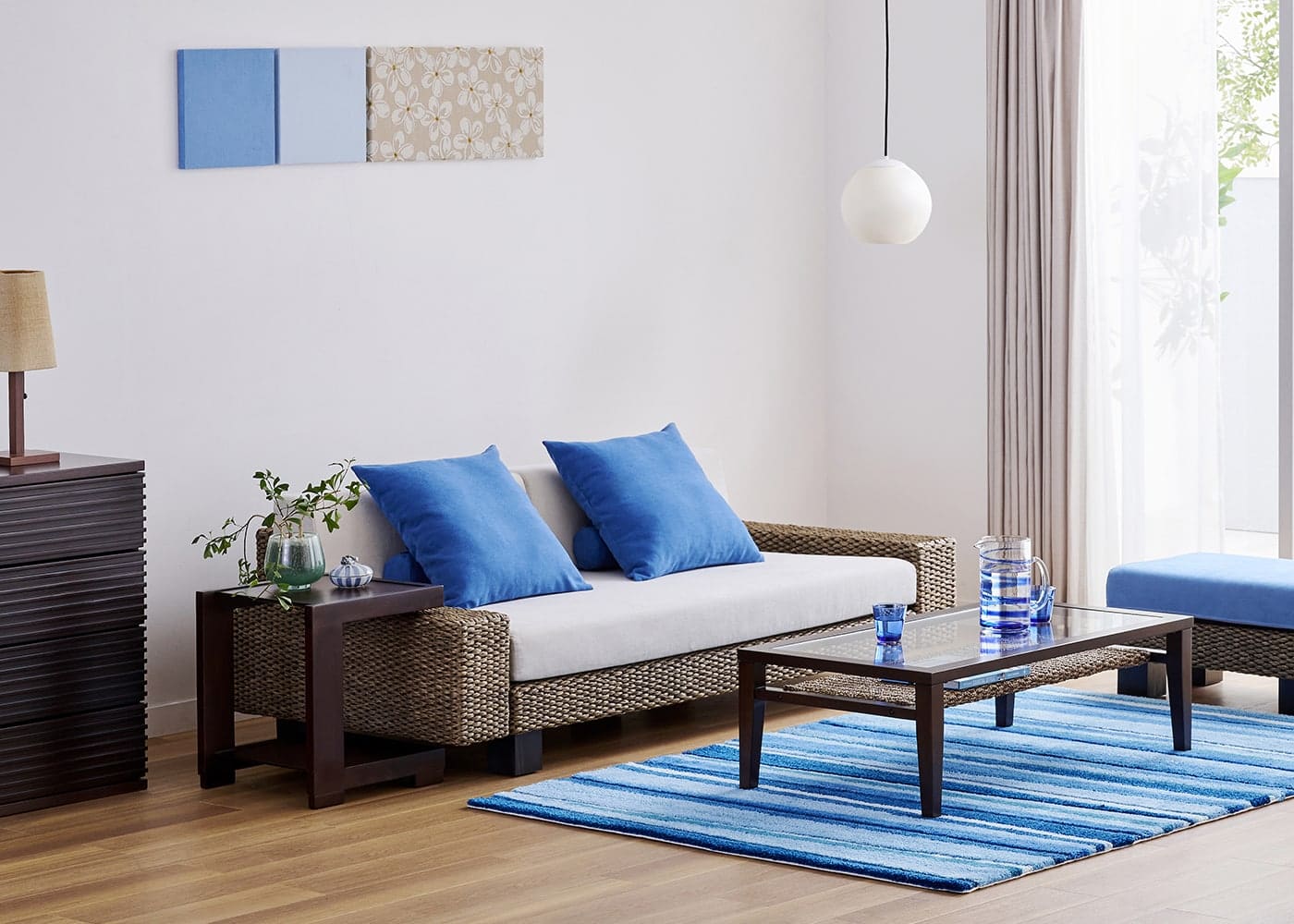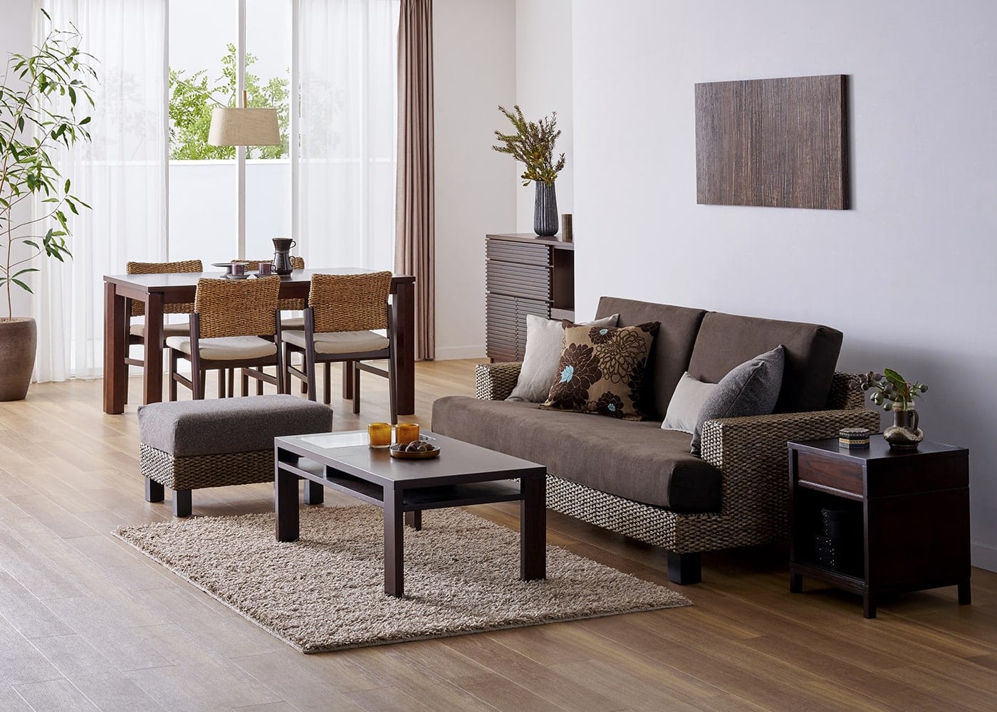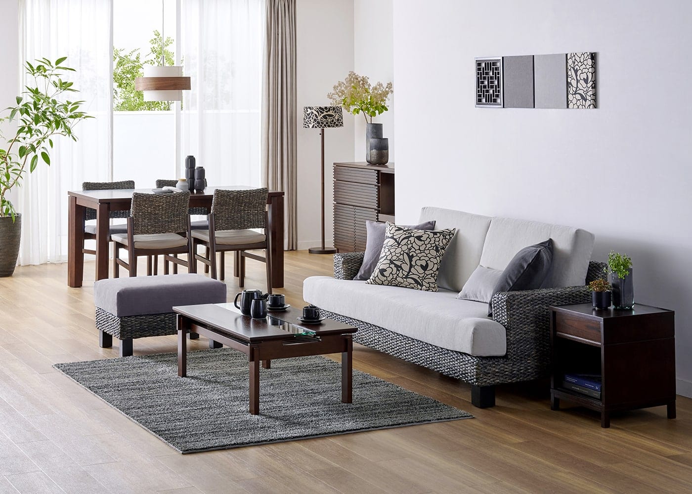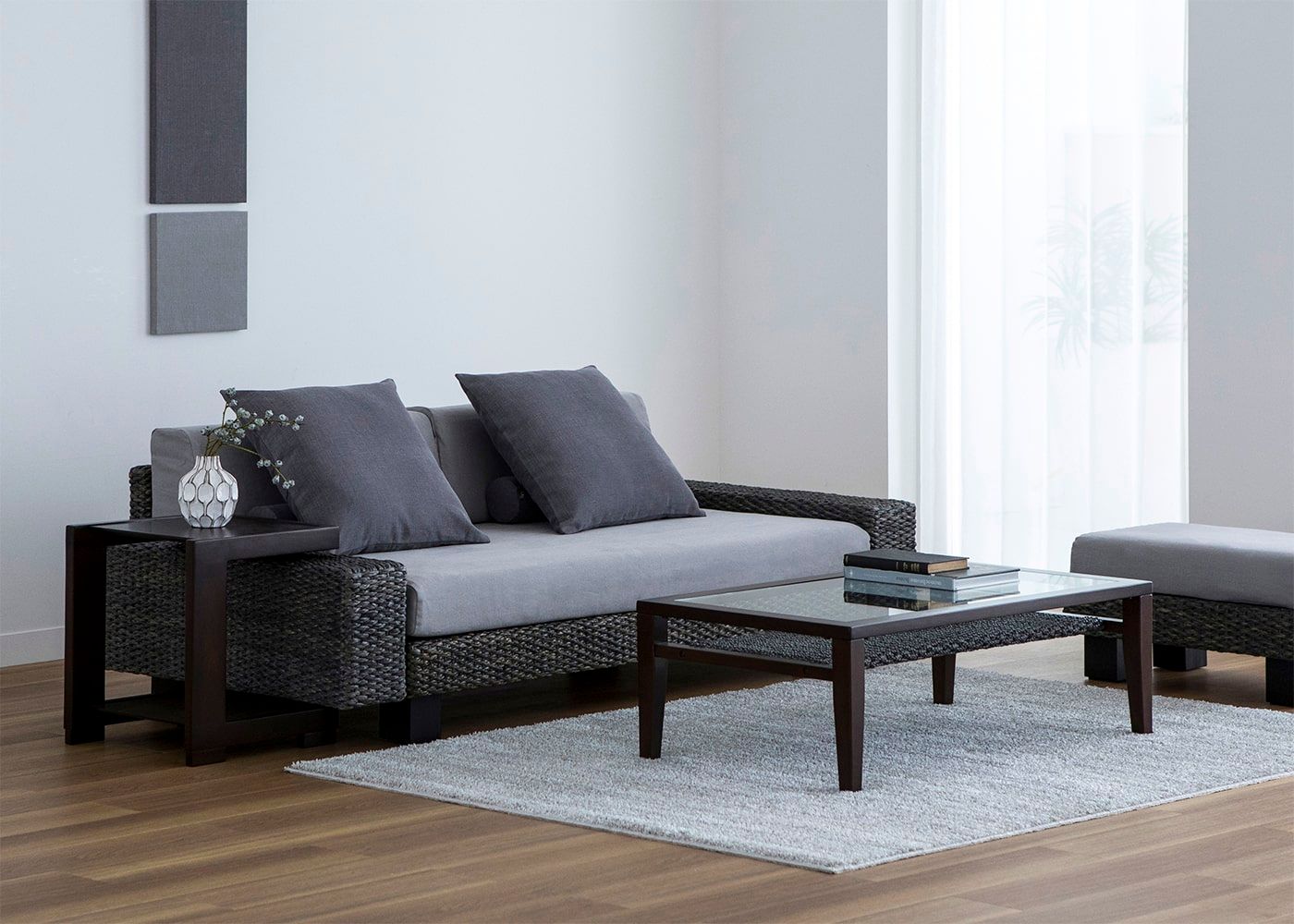 ウォーターヒヤシンスソファのダークグレー色は、落ち着いた色合いで大人のアジアンリゾートを演出するカラーです。ヒヤシンスの天然素材を染め上げることにより、自然な風合いとグレーの落ち着きがソファの魅力を存分に引き立たせてくれます。