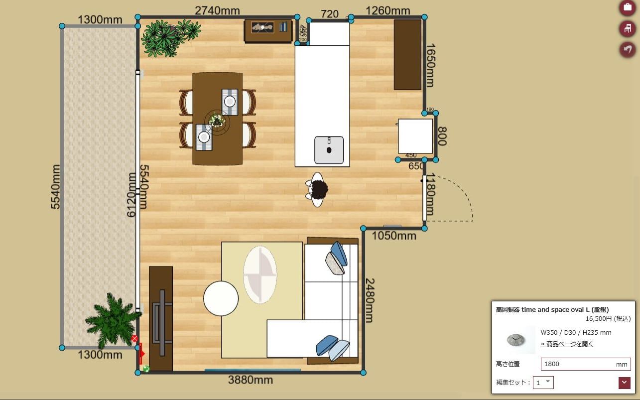 「高さ位置機能」を使って、壁掛け時計を床からの高さを1800mmにレイアウト。テレビボード・テレビと重ならないよう、また高い位置につけてお部屋のどこからでも見やすいようにしました。3D画面で見れば完成イメージが湧きますね。