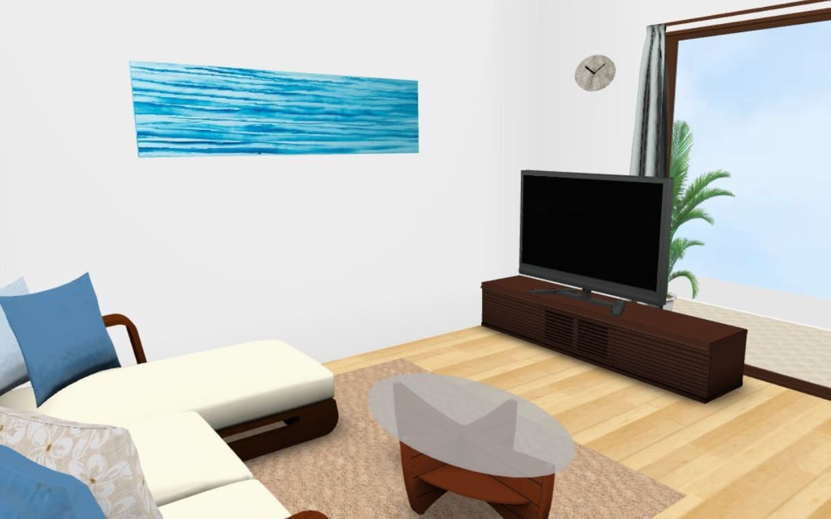 家具と壁飾りのレイアウトが決まったら、クッション・ラグ・カーテンなどの小物を追加してトータルコーディネートを行い、3D画面で確認します。