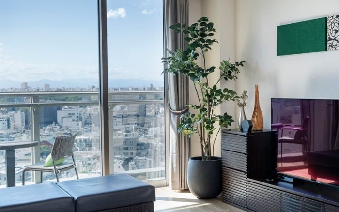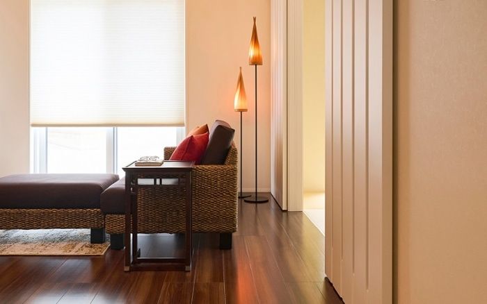 スペースを活用してフロアランプをコーナーに置くことで部屋に奥行きを感じさせてくれるでしょう。窓際には植栽もおすすめです。