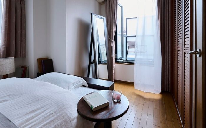 5.5畳のベッドルームに、奥行きの浅いデスクとコンパクトな椅子を配置し、作業スペースを確保した実例。通常はデッドスペースになりがちなコーナーを、効率的に活用することで、限られた空間にゆとりと機能性をもたらしています。また、逆側にコーナーにも姿見を置いて、無駄のないレイアウトに。