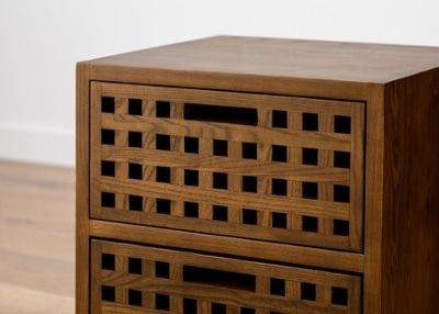 アッシュ無垢材ならではの素材感、サイズや形が自由自在に変えられる拡張性が魅力。脚の無いデザインなので畳を傷つけにくく、和室と相性が良い家具です。また、引き出しは格子とフレームのリバーシブル仕様で、気分や雰囲気に合わせて使えます。