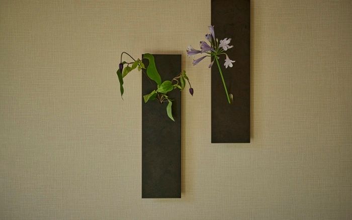 日本の伝統技術で作られた銅の壁掛け花器は、銅の温かみのある色合いと繊細な手仕事が、和室の落ち着いた雰囲気を引き立てます。
