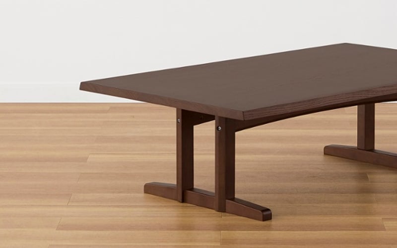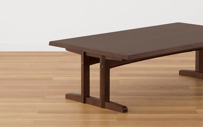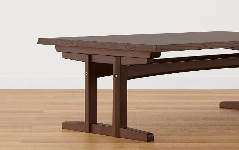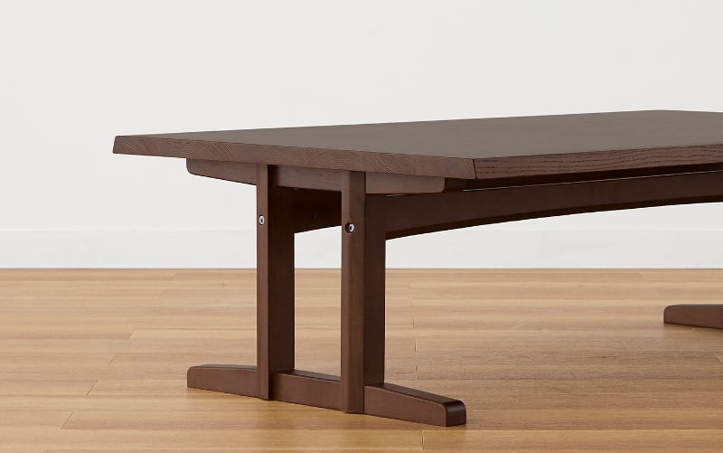 ベッドやソファと同様に重心の低いロースタイルのダイニングテーブル。落ち着いた色合いと無垢材に纏う心地良い重厚感と風合いが和室と良く合います。また畳との接地面が多い2本脚のデザインのため、畳に跡が残り辛いという点もポイントです。