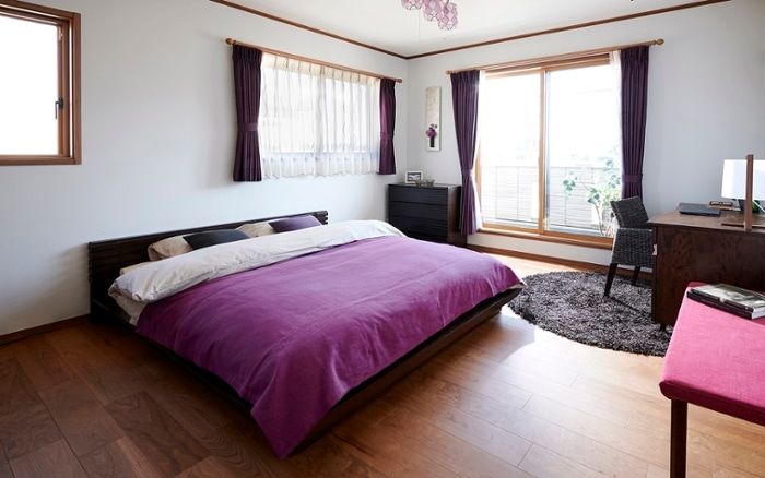 寝室8畳にクイーンベッドをレイアウトした実例。高さの低いフロアタイプのクイーンベッドを設置し、開放感がある寝室のコーディネートです。パープルのインテリアがラグジュアリーな雰囲気を演出しています。