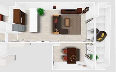 LDKにダイニングとソファの位置を逆にして配置したパターン。角部屋で窓が多いケースの場合はテレビボード位置の関係で、ダイニングテーブルをキッチンから離れた位置に配置することも考えられます。