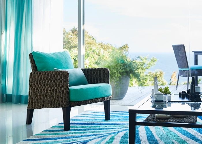 ヒヤシンスの素材感が活きた、ハワイのような癒しの空間実例。澄んだハワイの海や青空を思わせるターコイズブルーのカラーコーデを基調に、様々なくつろぎを楽しめるレイアウトが特長です。