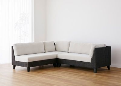 強い日差しによる熱や風雨による色褪せに強く、耐久性に優れた特殊な高密度ポリエチレン素材の屋外用ソファ。雨ざらしでも劣化しない特別なクッション材とカバーで、年中快適に使用できます。奥行を抑えたコンパクトデザインなので、4人掛けサイズでも比較的省スペースで設置が可能。自由に組替えができるため、様々なレイアウトを楽しめます。