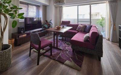 非日常のリラックス感を味わえるタワーマンションの実例。家族や友人を招いてホームパーティーを楽しむなど、広い部屋を最大限に生かした大人数でもくつろげるレイアウトです。
