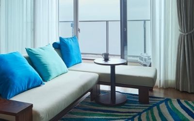 海沿いの別荘にロータイプのコーナーセットを配置。窓への抜け感を遮らず開放感たっぷりです。
