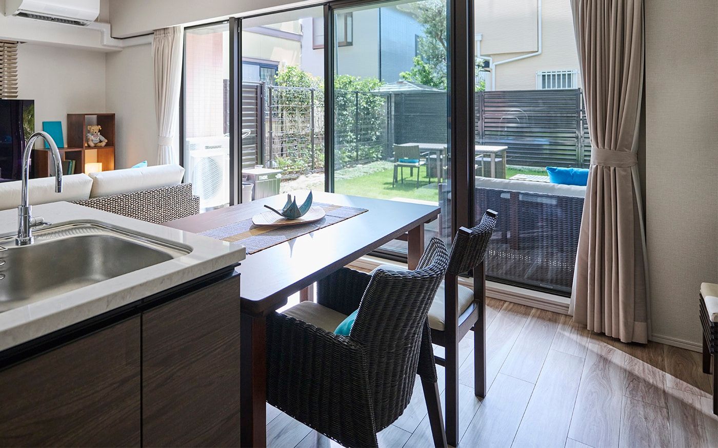 美しい借景を活かしたレイアウトの横長ダイニング実例