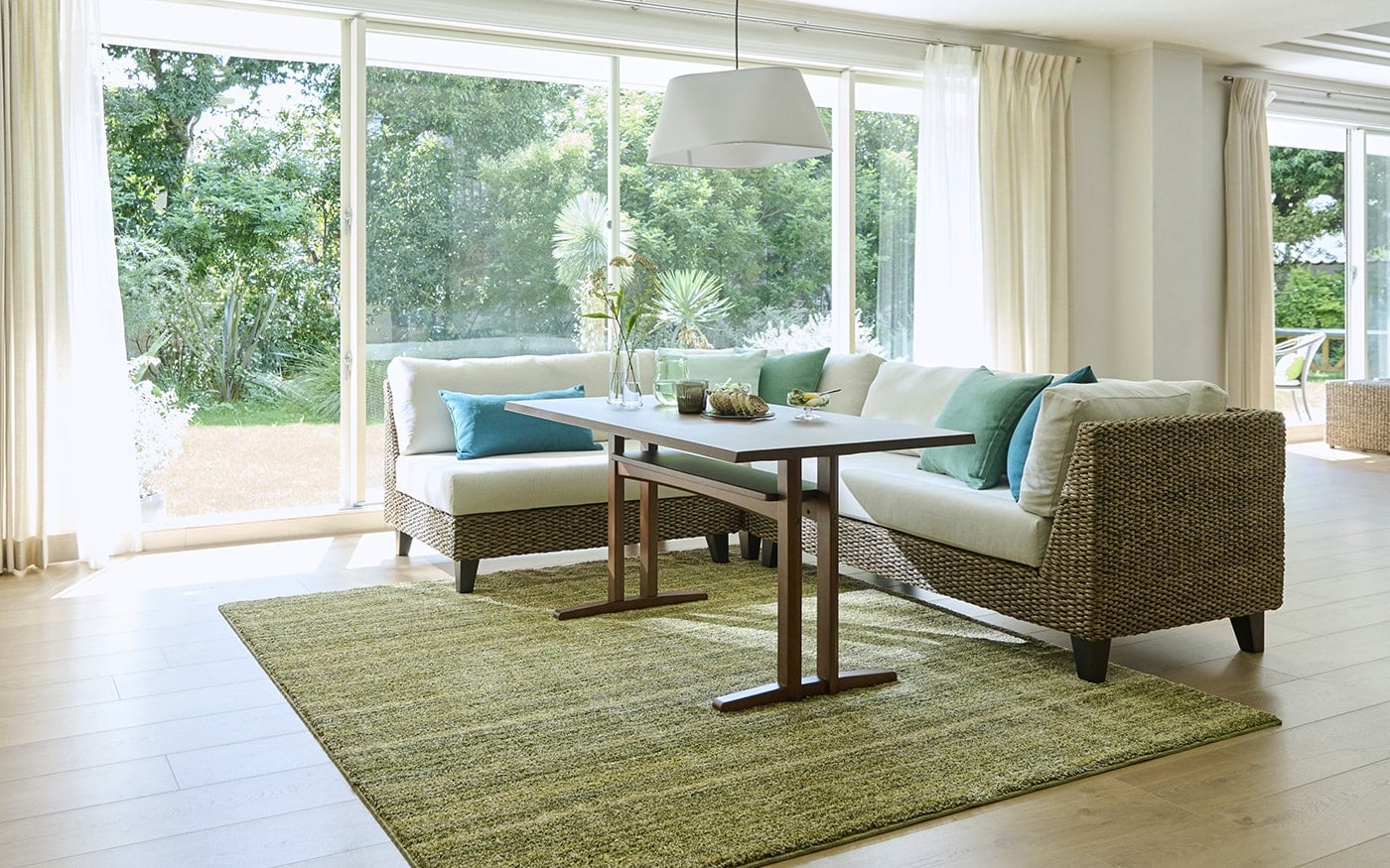 川の字レイアウトを採用したソファダイニングは、空間を有効に活用し、快適な通路を確保しています。片側をオットマンにすることで、テーブル周りにゆとりを持たせ、家族や友人が集まるダイニングスペースをより開放的に演出。この工夫により、限られた空間でも快適なダイニングエリアを実現しています。
