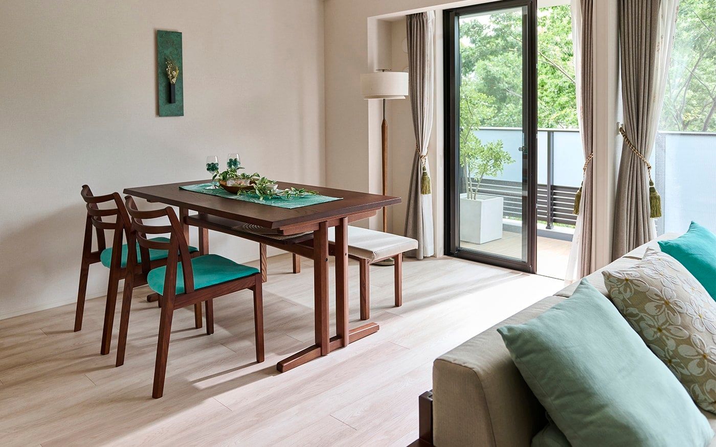 女性にも人気の淡いミントグリーンを基調にしたリビングダイニング。4人掛けダイニングセットの周りにゆとりのスペースを確保しています。チェアカバーやブランケットで温もりを、また球体ペンダントライトで柔らかな光を添え、自然素材のロースタイル家具で落ち着いた空間を作り出しました。