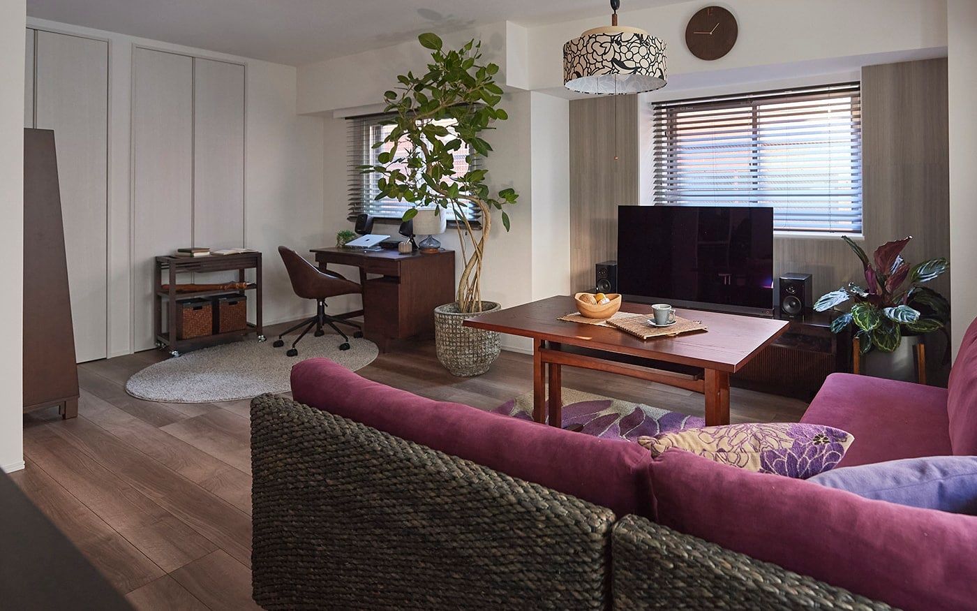 江の島の風を感じながら、一人暮らしの女性が自分だけの空間を楽しむインテリア実例をご紹介。床色に合わせたダークブラウンの家具でまとめた空間に、海でのサンセットをイメージしたパープルをアクセントにした落ち着きがあるおしゃれな部屋は、日々の生活をリラックスして過ごすための理想的な空間になりました。女性一人暮らしの部屋がおしゃれな空間になるよう、ポイントも含めてご紹介しますので是非参考にしてみてください。