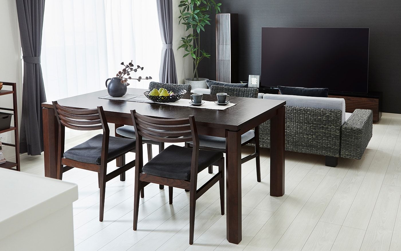 戸建ての縦長リビングに最適な伸長式ダイニングテーブルを配置し、限られた通路幅でも快適な生活動線を確保。二人暮らしにぴったりのゆったりとした食事空間を実現しました。ゲストが来た時は幅140cmに伸長して、4人掛けダイニングテーブルとしても使用可能です。