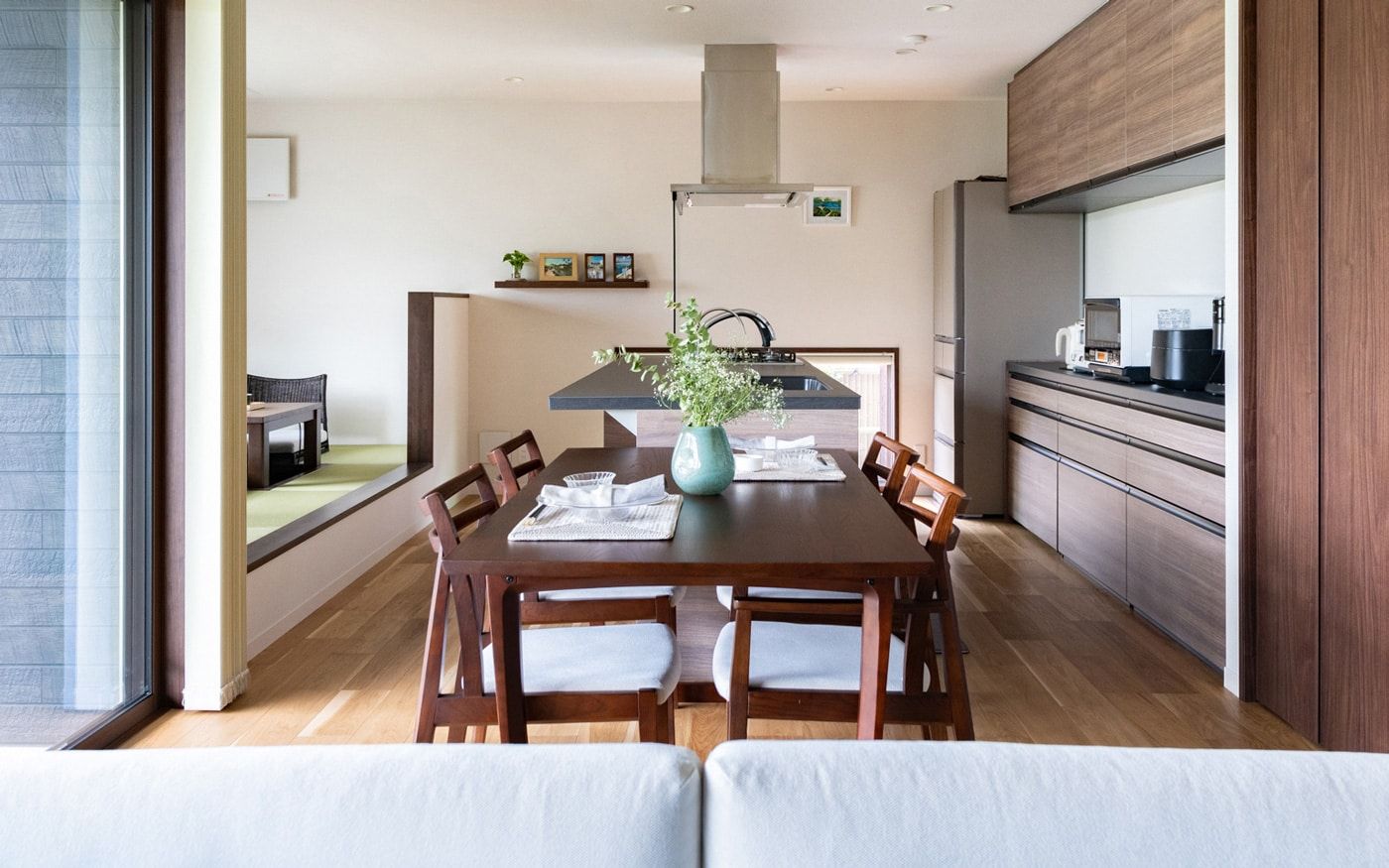 広々とした16畳の横長LDKには、4人掛けのダイニングテーブルが配置されています。ソファと同じ無垢材で空間に統一感をもたらし、ハイバックタイプの椅子がまとまりのあるデザインを演出しています。通路も十分な幅を確保し、開放的なダイニングスペースを実現しました。