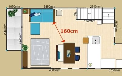 もし、部屋のサイズにゆとりが有る時は、ソファからテレビまでの距離を少し広げるのがおすすめです。ソファでゆったりテレビを見たい、ソファとテレビの間を人が通りやすくする、テレビ前で作業を行う、など快適な生活動線に繋がります。次はゆとりを持った配置パターンを見てみましょう。