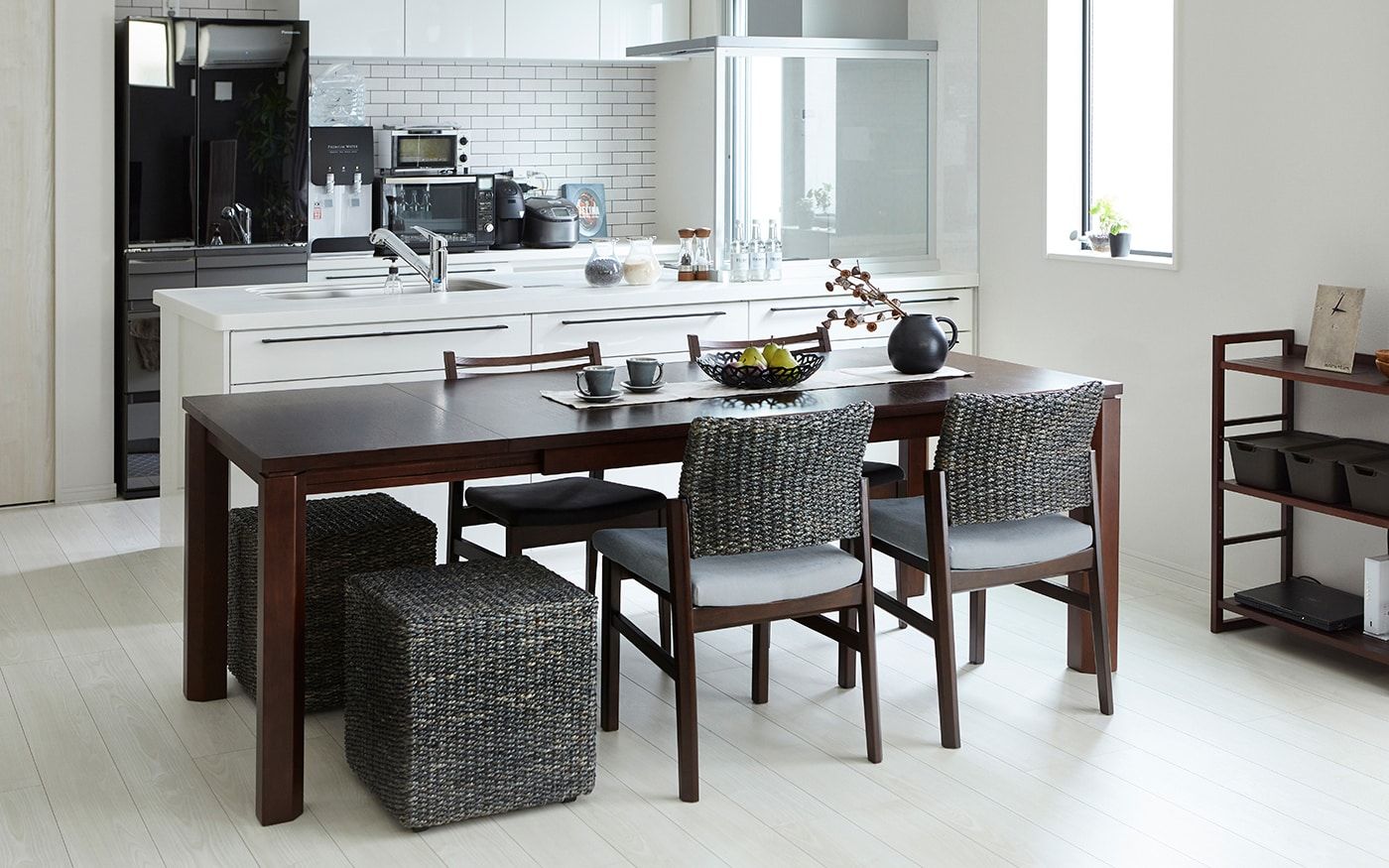 1LDKのリビングダイニング8畳のレイアウト例。2人掛けソファ+オットマンで快適なスペースを設けました。また、一人暮らしでのダイニングテーブルは食卓用だけで無く、仕事用としても使うケースも。そのため、伸長式のダイニングテーブルや本棚も配置したレイアウトを採用しています。