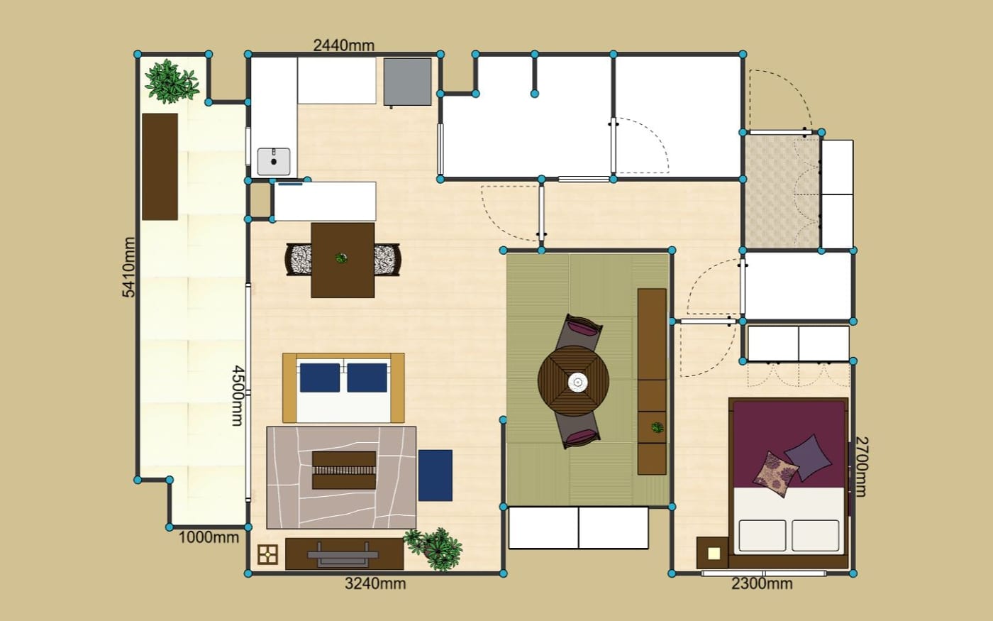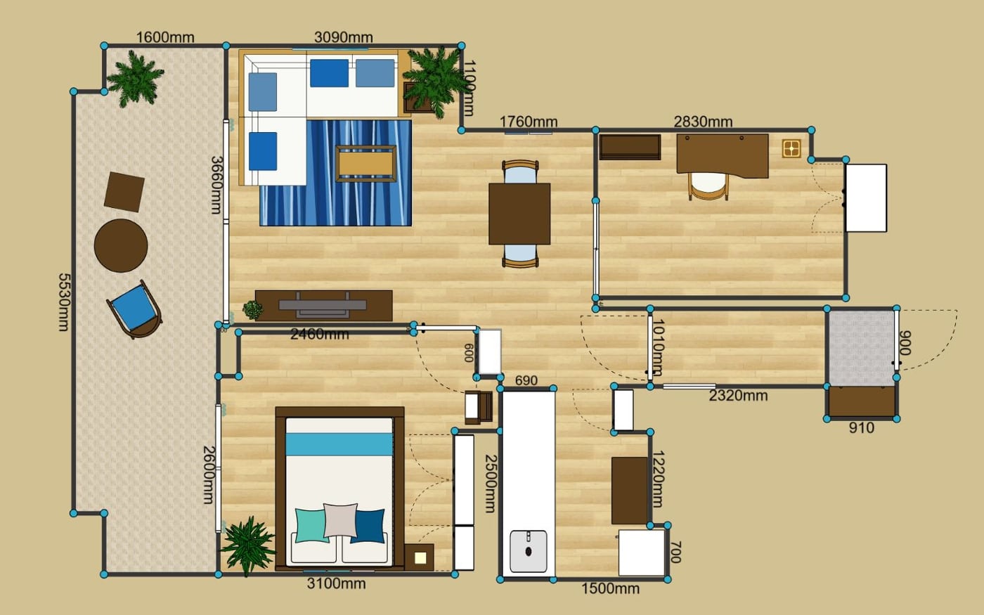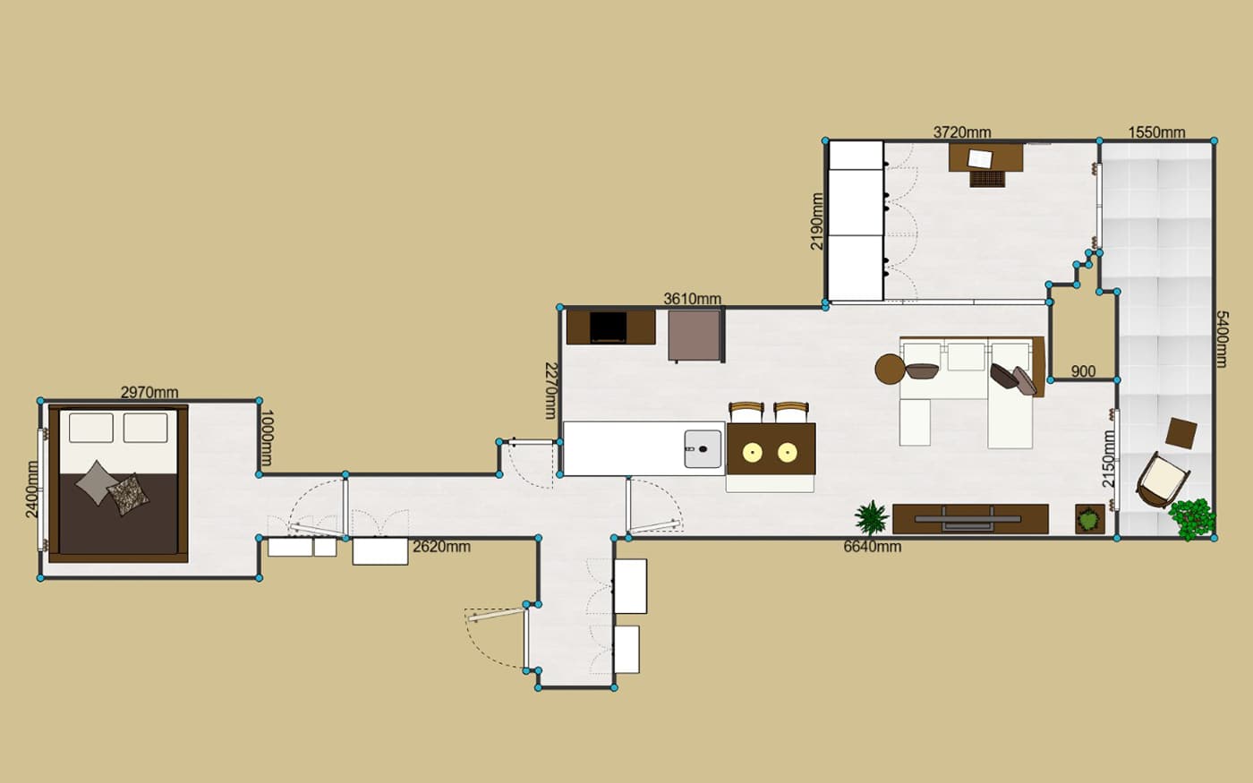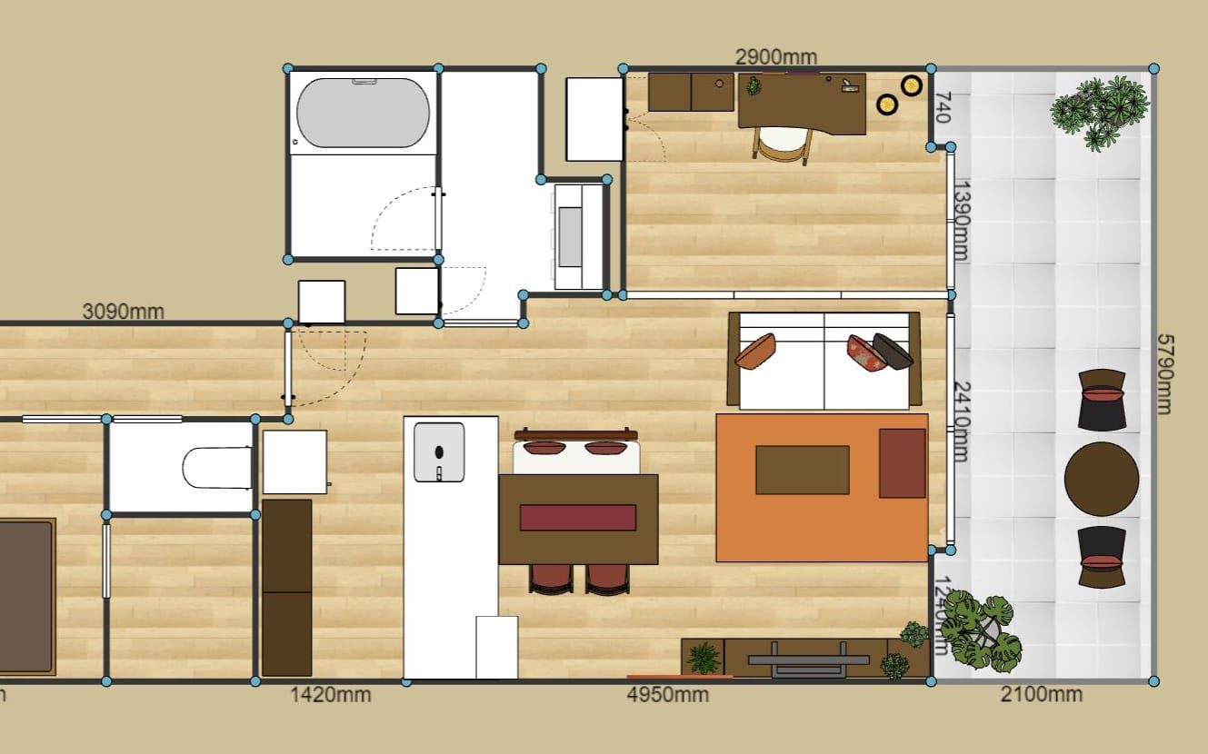 上記は2LDKレイアウトの参考例です。このケースでは、LDKと隣接した部屋を繋げてソファの後ろに主寝室を設けました。また、逆側の部屋をリモートワークできる書斎として使い、お子様が生まれたら後に子供部屋に。このように、ライフスタイルやロケーションに合わせたレイアウトが大事になります。