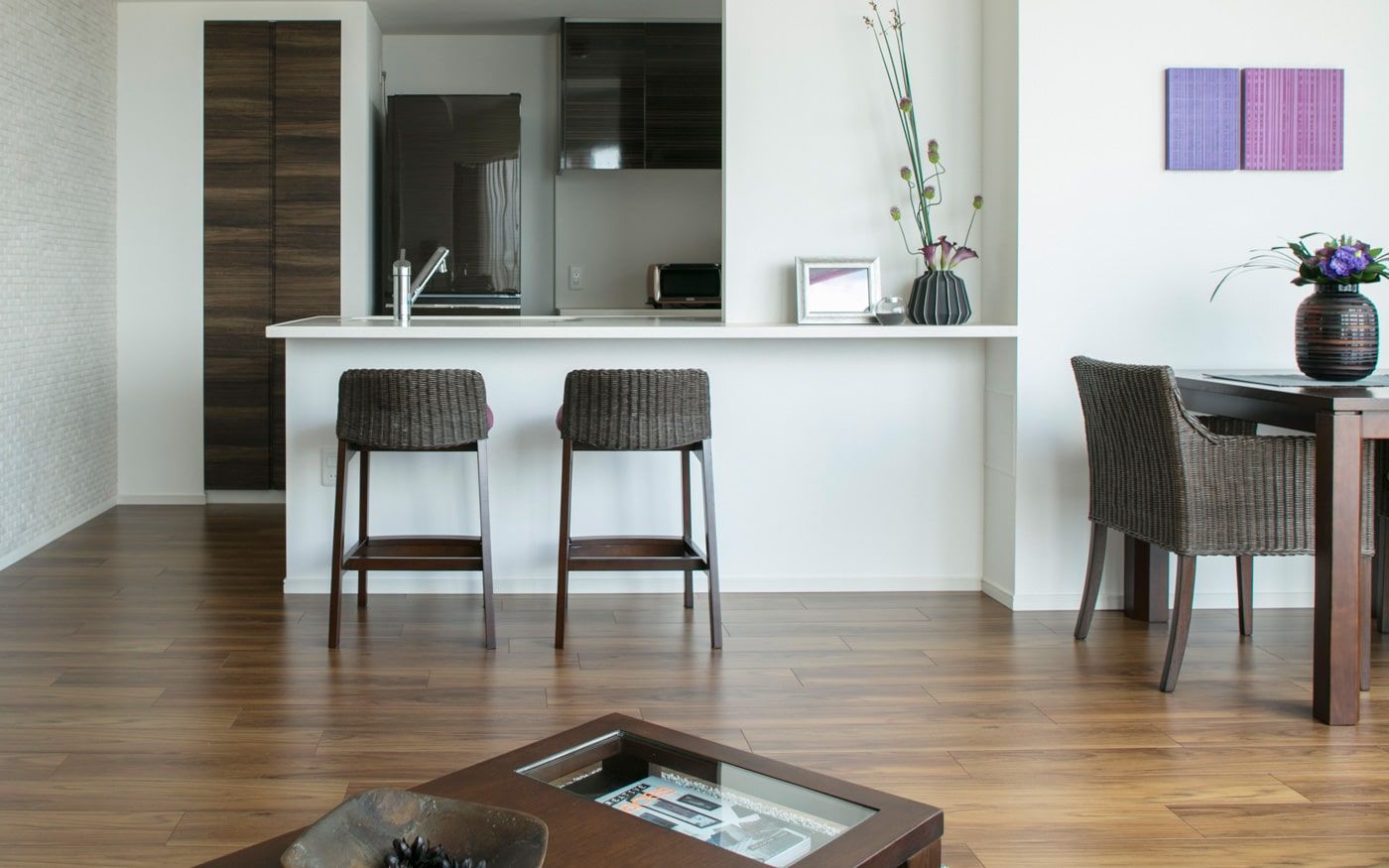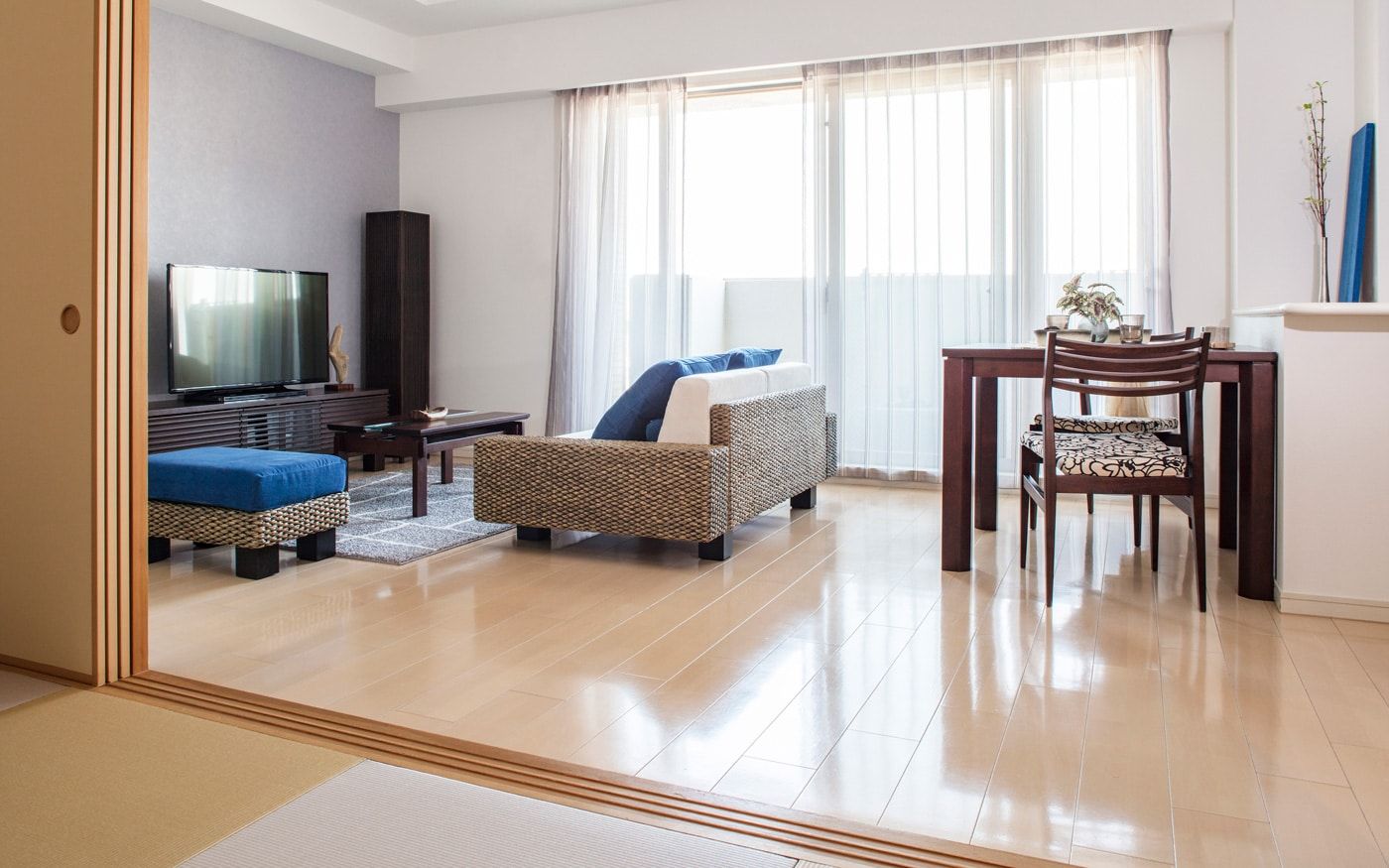 2LDKのマンションに最適なインテリアをご提案します。特に和室にマッチするローソファは、限られた空間を有効に使いながら、落ち着いた雰囲気を作り出します。開放感あふれるリビングダイニングと和室の調和が取れた空間は、都会の忙しさを忘れさせるリゾートのような癒しを提供します。ナチュラルな床材とヒヤシンス素材のローソファが、和室の魅力を引き立てることでしょう。お部屋のコーディネートに役立つアイテムを多数ご用意しております。