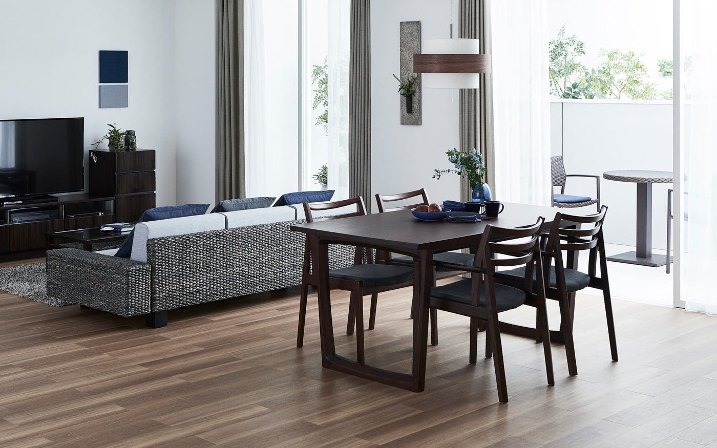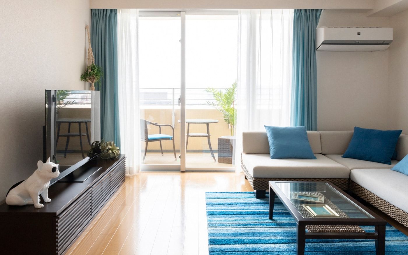 2LDKのリビングダイニング14畳のレイアウト例。横長リビングの魅力でもある横に広がる大きい窓と相性よい、開放的なブルーのカラーコーデが涼し気です。また、広いベランダとLDKをシームレスに見せるレイアウトを組んで、外の心地良い空気を感じられる「アウトドアリビング」を実現しました。