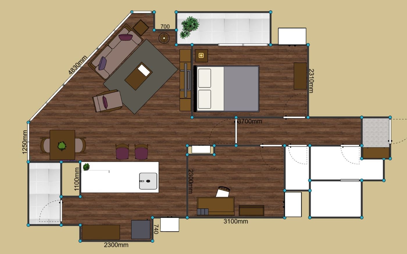 ダークブラウンで統一したシックな部屋:2LDKのレイアウト例 (LD18畳)