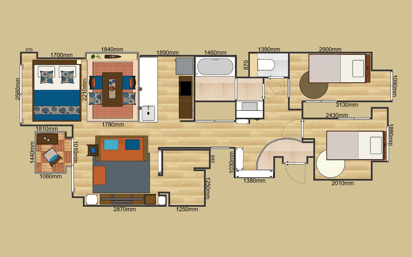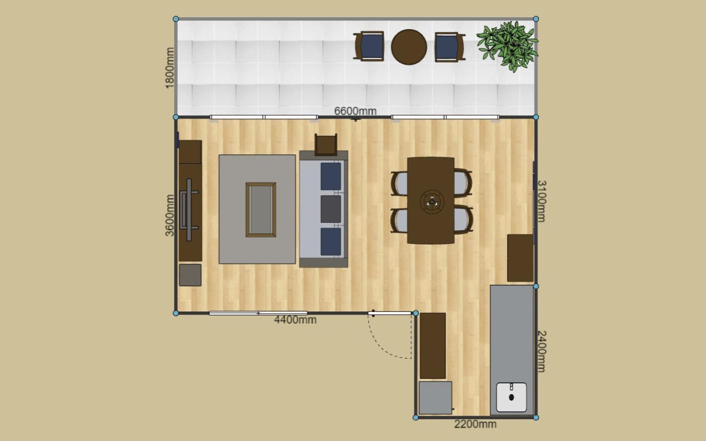 別荘のロケーションを活かす家具配置:2LDKのレイアウト例 (LD14畳)