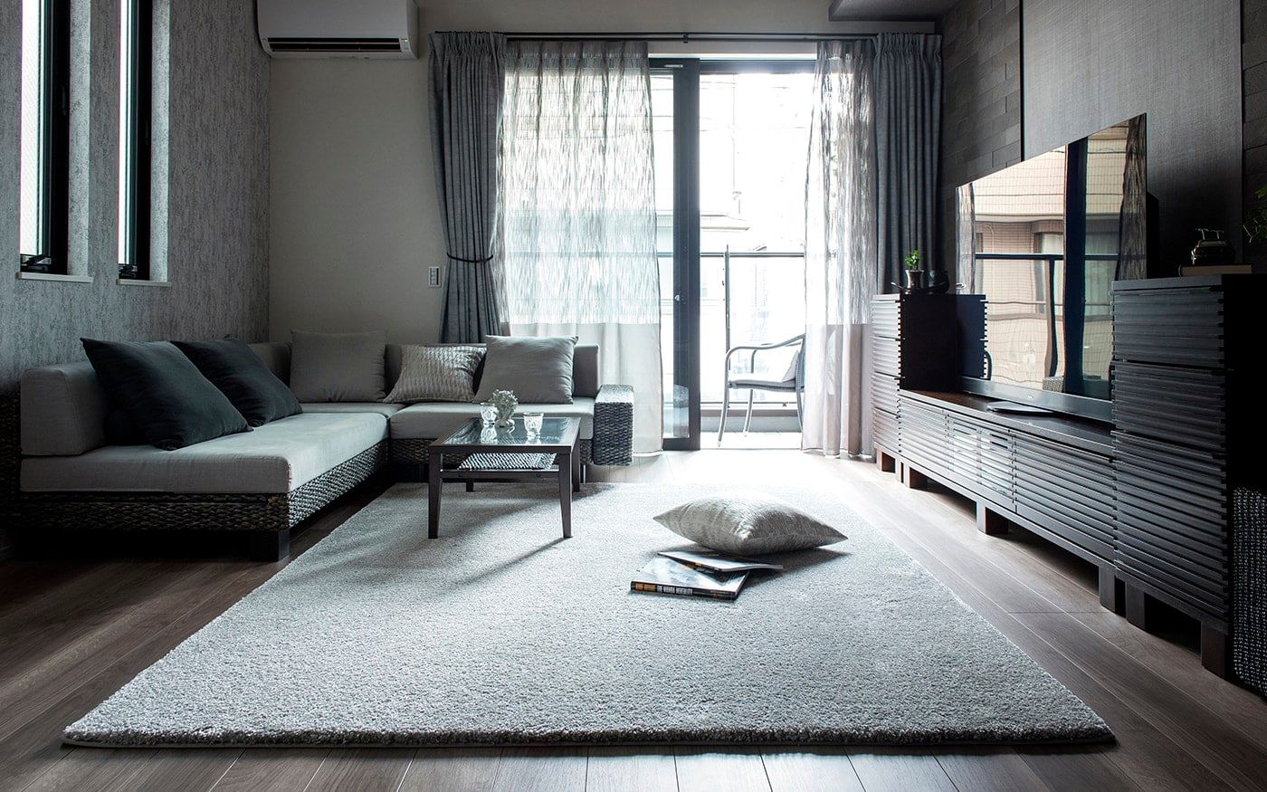 クラウドグレー・スタイル~悠然につつまれる~のページです。グレー特有の凛とした表情と澄み渡る空気感が、リラックスできる時間を演出してくれるクラウドグレー・スタイル。グレーに美しく染め上げたローソファや石のテーブルが主役のリビングです。様々な自然素材をベースにしたグレーの家具とファブリックを用いて、モダンで優し気な空間に。雲霞を想わせるような、色とりどりのグレーで作り上げたカラーコーディネートに包まれてリラックスできます。